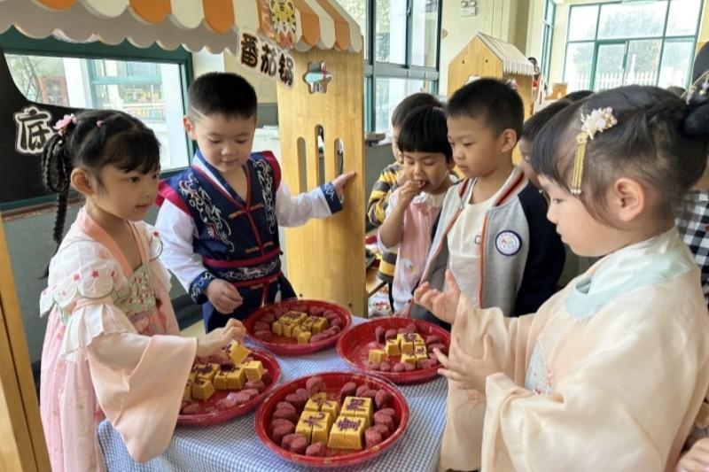 孩子们通过逛市集、做调查,知道市集可以怎么布置、可以卖什么,根据收集到的资料用心设计、布置自己班的市集小摊:“登高望远”、“遍插茱萸”、“采菊东篱 ”、“重阳糕暖”、“时光照相馆”、“布里生花”、“菊织物语”、“松松花艺”……一个个富有诗意的小摊名字新鲜出炉。孩子们穿行在市集中,吃着甜甜的重阳糕,这里瞧瞧,那里玩玩,别提有多高兴了。在这温情的节日里,孩子们用实际行动践行着对长辈的爱与感谢:一声声甜甜的问候、一个个温暖的拥抱、捶捶背、捏捏肩、洗洗脚、倒杯茶……并送上自制的节日礼物,祝爷爷奶奶“柿柿”如意、寿比南山。